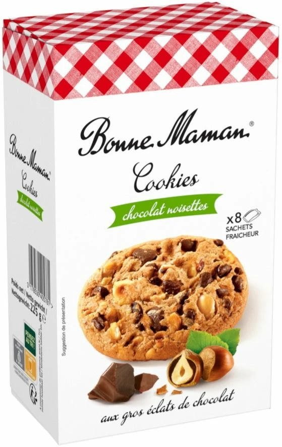 Bonne Maman gourmet cookies with chocolate chips and hazelnuts. To preserve all its flavor and crispness, each Bonne Maman cookie is carefully packaged in its own little freshness sachet.
