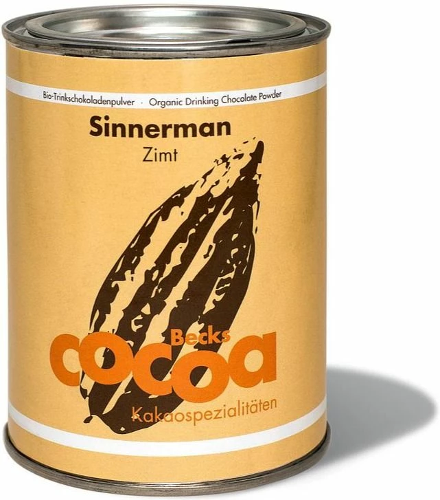 Becks Sinnerman fine organic cocoa hot chocolate drinking powder, composed very subtly with the fine taste of real Ceylon cinnamon.