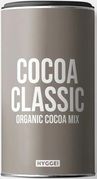 Hygge Organic Cocoa hot chocolate drinking powder original style. Made with natural organic cocoa powder. Just mix with warm frothed milk and enjoy! Also good with soy, almond or oat milk.