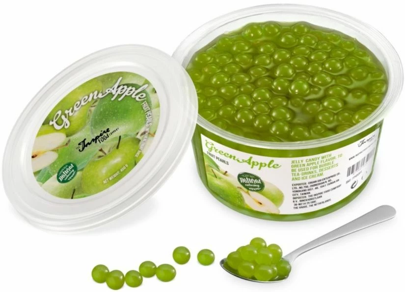 The Bubble Tea Green Apple fruit pearls taste great in bubble tea, cordials, cocktails and even in desserts. The Inspire Food Company fruit pearls contain real fruit juice.